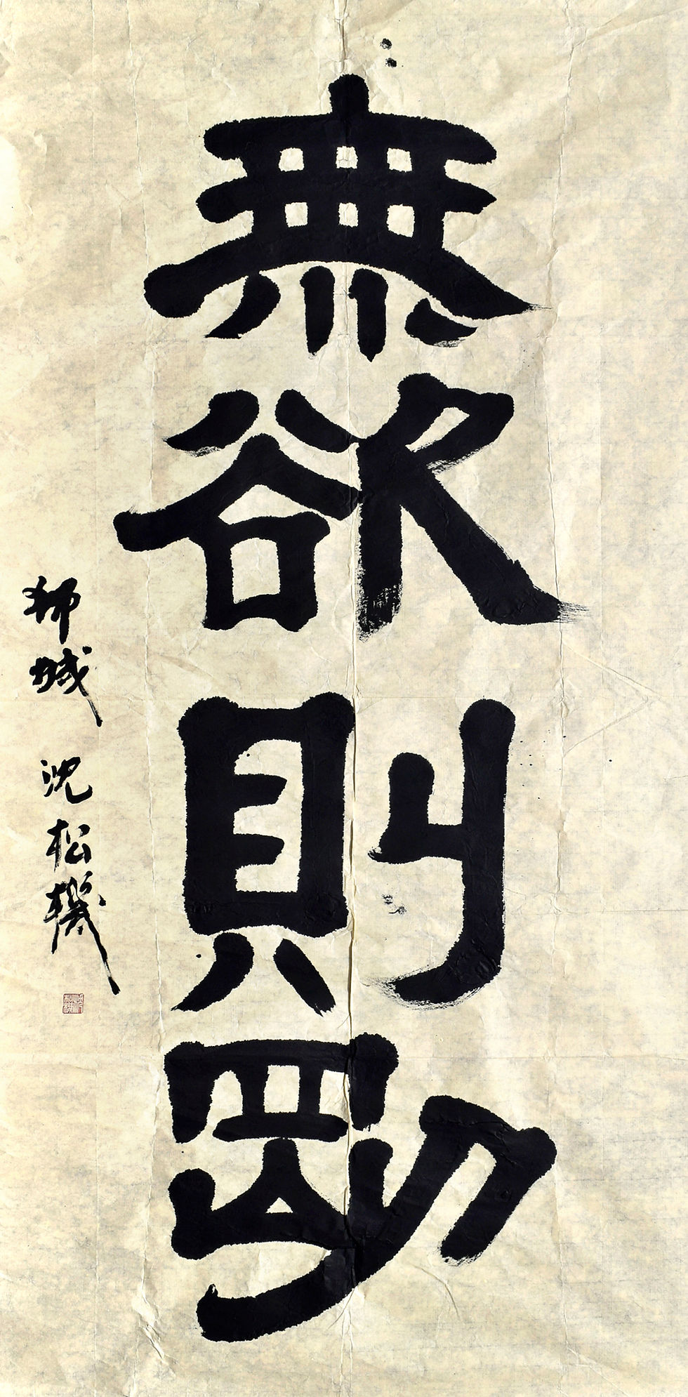 沈松机是新加坡狮城书法篆刻会理事,曾任汉石书艺学会副会长。他是著名书法家石公黄国良(1920-2004)的女婿,深受其熏陶和影响。黄国良以专写隶书闻名,一生深研隶书,造诣深厚。沈松机对隶书也情有独钟,临书时不急不缓,专注用笔,笔法兼具方、圆、藏、露,笔势飞动,姿态优美,柔中有序,动中有静。业内人士评价其书法风格“甚类唐玄宗,波磔极显却圆润大气”。